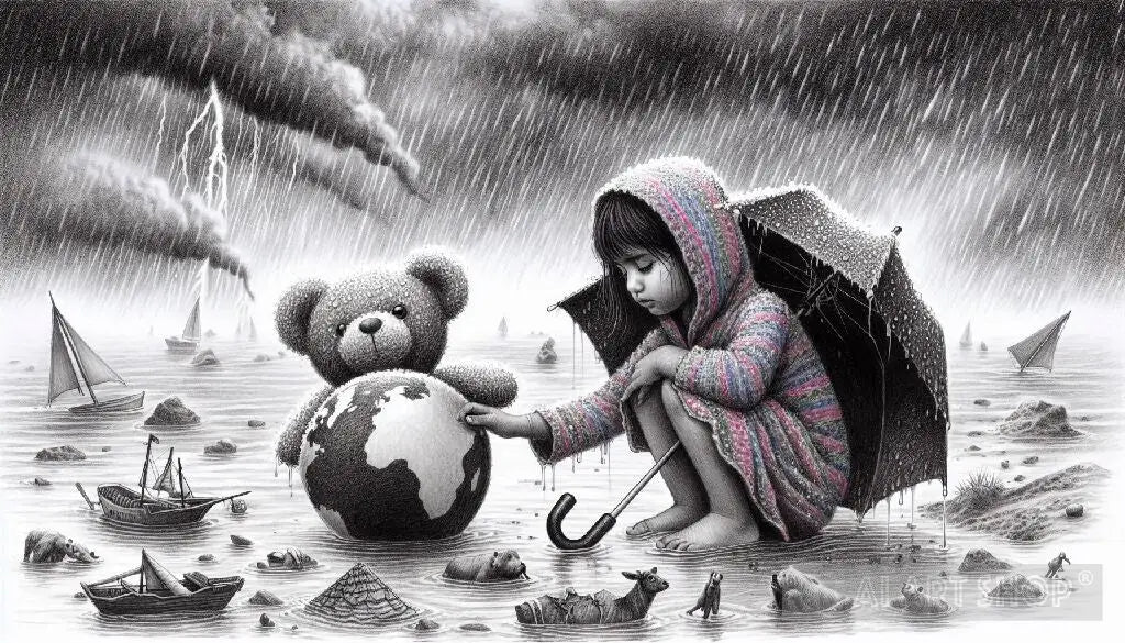 Polar Solitude —-Child Lost Teddy Bear Due to Global Warming: In this poignant and thought-provoking image, a child stands amidst a changing landscape. The once familiar surroundings have been altered by the effects of global warming. The child clutches a tattered teddy bear, a symbol of comfort and innocence. The extreme temperatures—scorching heat and bitter cold—have reshaped life as we know it. Rain and snow fall irregularly, disrupting ecosystems and challenging our resilience. The pencil-drawn realism captures the urgency of the climate crisis, : In this poignant and thought-provoking image, a child stands amidst a changing landscape. The once familiar surroundings have been altered by the effects of global warming. The child clutches a tattered teddy bear, a symbol of comfort and innocence. The extreme temperatures—scorching heat and bitter cold—have reshaped life as we know it. Rain and snow fall irregularly, disrupting ecosystems and challenging our resilience. The pencil-drawn realism captures the urgency of the climate crisis,