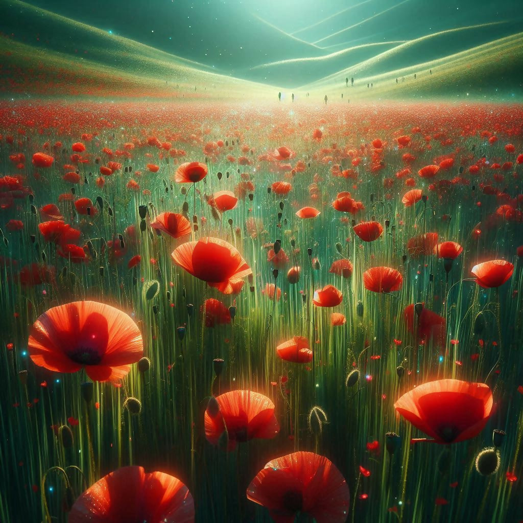 A vast, sweeping meadow bursting with thousands of wild poppies swaying gently in a soft summer breeze. The flowers create an ocean of intense, vibrant crimson reds and vivid scarlet petals that catch and shimmer with golden sunlight, their delicate surfaces glistening with subtle highlights and delicate sheen. Tall emerald-green stems and grasses form a rich contrasting carpet beneath, dotted with hints of sunny yellow and soft purple wildflowers. In the far distance, tiny human figures stroll leisurely along a faint path, reduced to small silhouettes that emphasize the immense scale and peaceful solitude of the landscape. The sunlight dances across the scene, creating sparkling highlights on the petals and a warm, luminous glow that infuses the entire composition with joyful vitality and serene natural beauty.