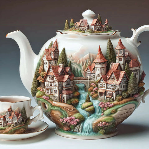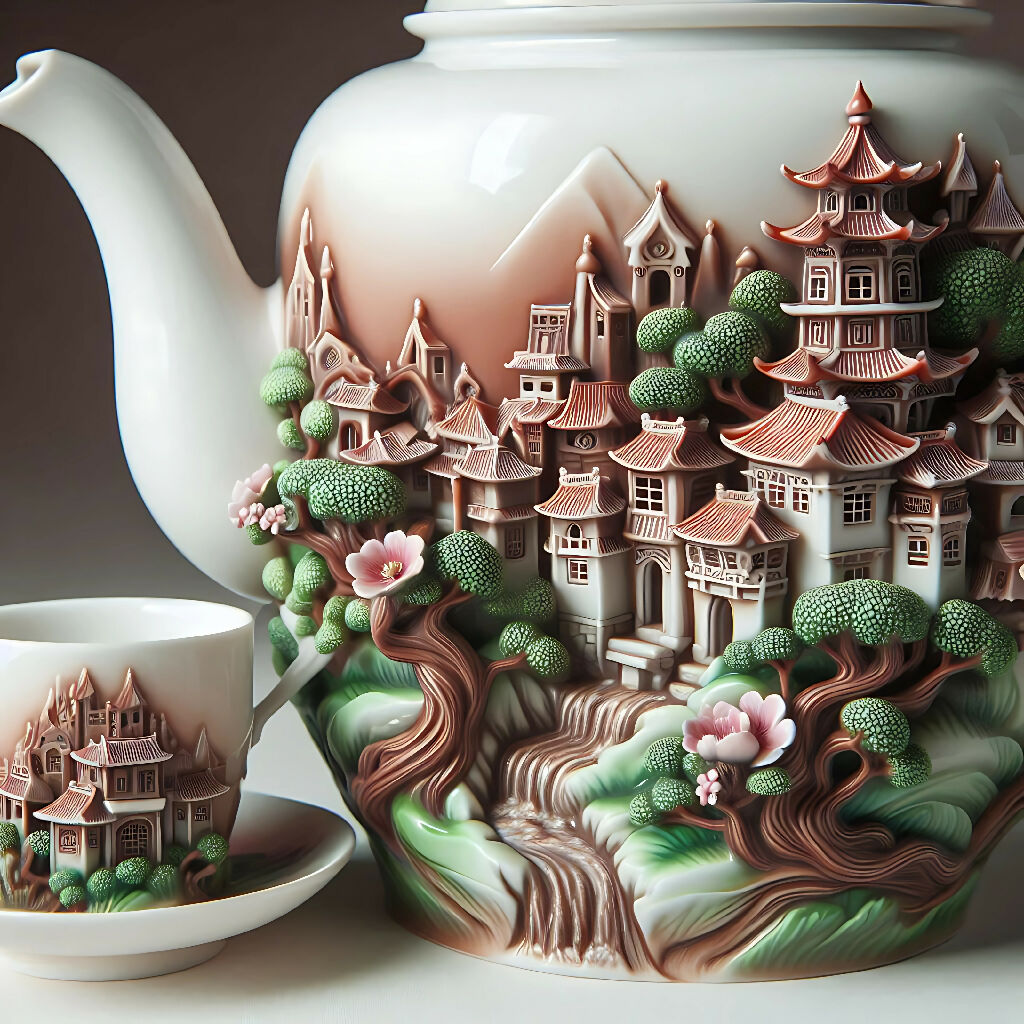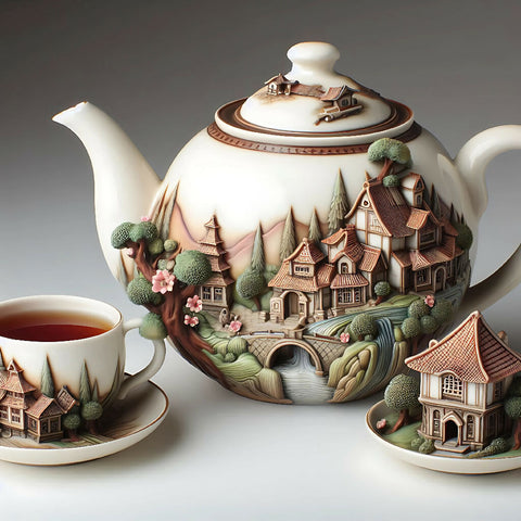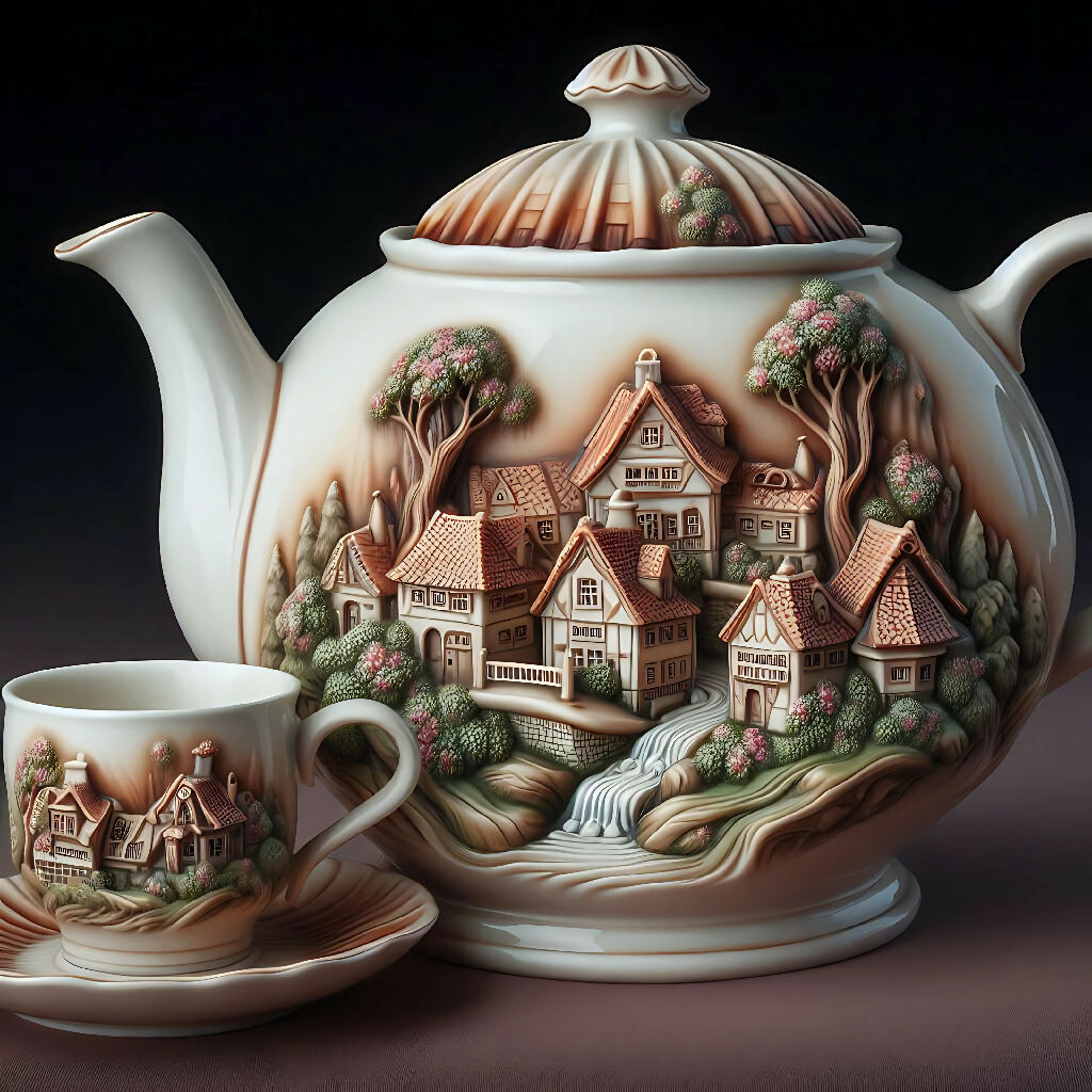 A porcelain tea set, featuring a teapot and cup and saucer, is depicted.  The teapot's exterior is intricately detailed with a sculpted miniature landscape.  The scene portrays a charming village nestled in a valley, complete with stylized houses, trees, and a babbling brook.  The houses have reddish-brown tiled roofs, and the trees are depicted in deep greens and browns.  Pink flowers are sculpted into the landscape. The teapot's body is off-white, and the details are in various shades of green, brown, and pink.  The cup and saucer feature a delicate floral pattern with pink and brown accents on a white background. Gold trim adorns the edges of both the cup and saucer.  A cup of amber-colored tea is visible inside the cup.  The image is in a high-detail, almost three-dimensional, style, with a focus on fine craftsmanship and realistic textures. The lighting is soft and even, highlighting the intricate details. The composition is centered on the tea set, drawing the viewer's eye to the elaborate decorative scene on the teapot.  The overall atmosphere is one of elegance, nostalgia, and tranquility. The perspective is from a slightly elevated, close-up angle, showcasing the detailed craftsmanship of the pieces.