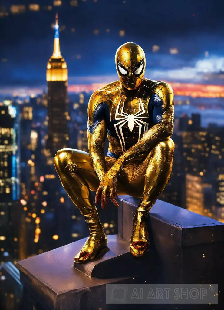 Portrait painting of Spider-Man wearing a gold metallic suit, ultra realistic, concept art, intricate details, eerie, highly detailed, photorealistic, octane render, 8k, unreal engine. art by artgerm and Jim Lee, NYC in the background, Full Body, Night time