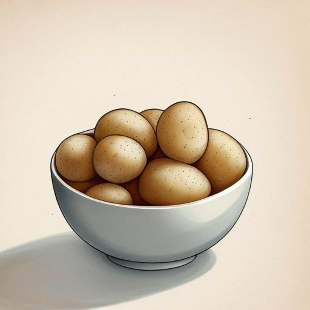 An illustration of a bowl of potatoes with a light brown background. The potatoes look great to use for cooking in the kitchen.