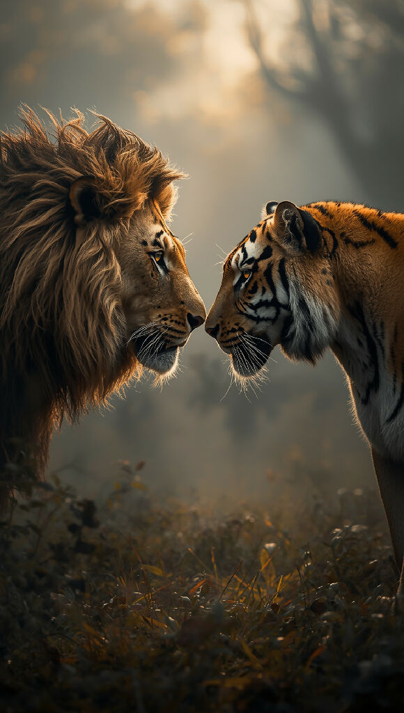 powerful lion and a majestic tiger standing face to face, intense eye contact, in the middle of a misty jungle clearing at dawn, high detail, ultra-realistic, cinematic lighting, dramatic atmosphere, dynamic animal pose, sharp fur texture, Leonardo Diffusion