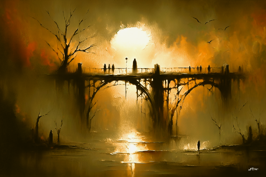In the realm of twilight, where shadows merge,Stands a figure preaching, on a broken bridge.His words, like whispers, in the cooling breeze,Carry tales of hope, to hearts they seize.Listeners gather, in the sunset's glow,Drawn to the sermon, letting their worries go.A painting dark yet hopeful, under the setting sun,'Preach on a Broken Bridge', the day is done.In the canvas of life, where stories are spun,The painting speaks volumes, its tale has begun.