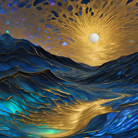 The golden light and deep blue waves create a striking contrast, giving it an ethereal, almost dreamlike quality.