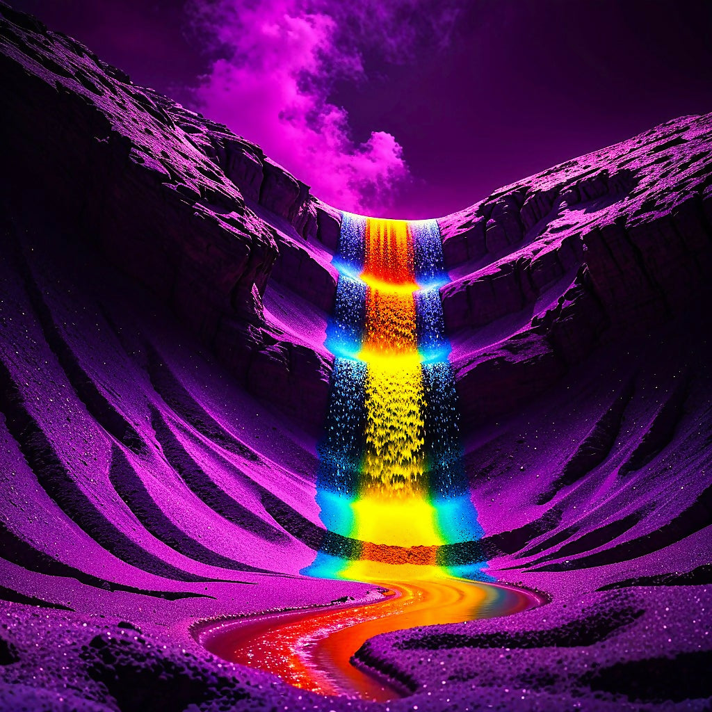 A surreal masterpiece featuring a breathtaking multicolored waterfall cascading down a rocky cliff. The radiant hues of blue, yellow, orange, and red flow into a winding river, enveloped in a deep purple glow. This mesmerizing vision of light and color creates a dreamlike ambiance, perfect for fantasy-inspired interiors and artistic collections.