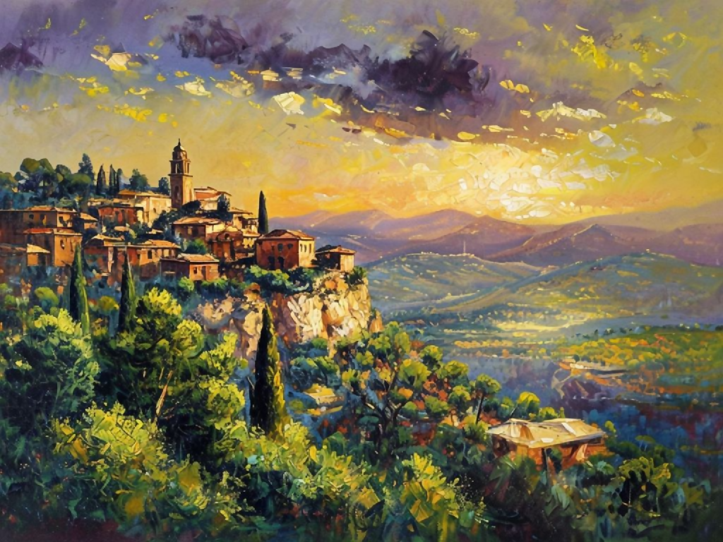 Immerse yourself in the enchanting beauty of France with this captivating Provence hilltop village painting digital art. This stunning artwork vividly portrays a charming St-Paul-de-Vence sunset scene, featuring picturesque French countryside, ancient architecture, and a warm, glowing sky. Perfect for European wall decor, rustic home art, or a unique printable gift, this high-quality instant download wall art brings the idyllic charm of Southern France directly into your home.