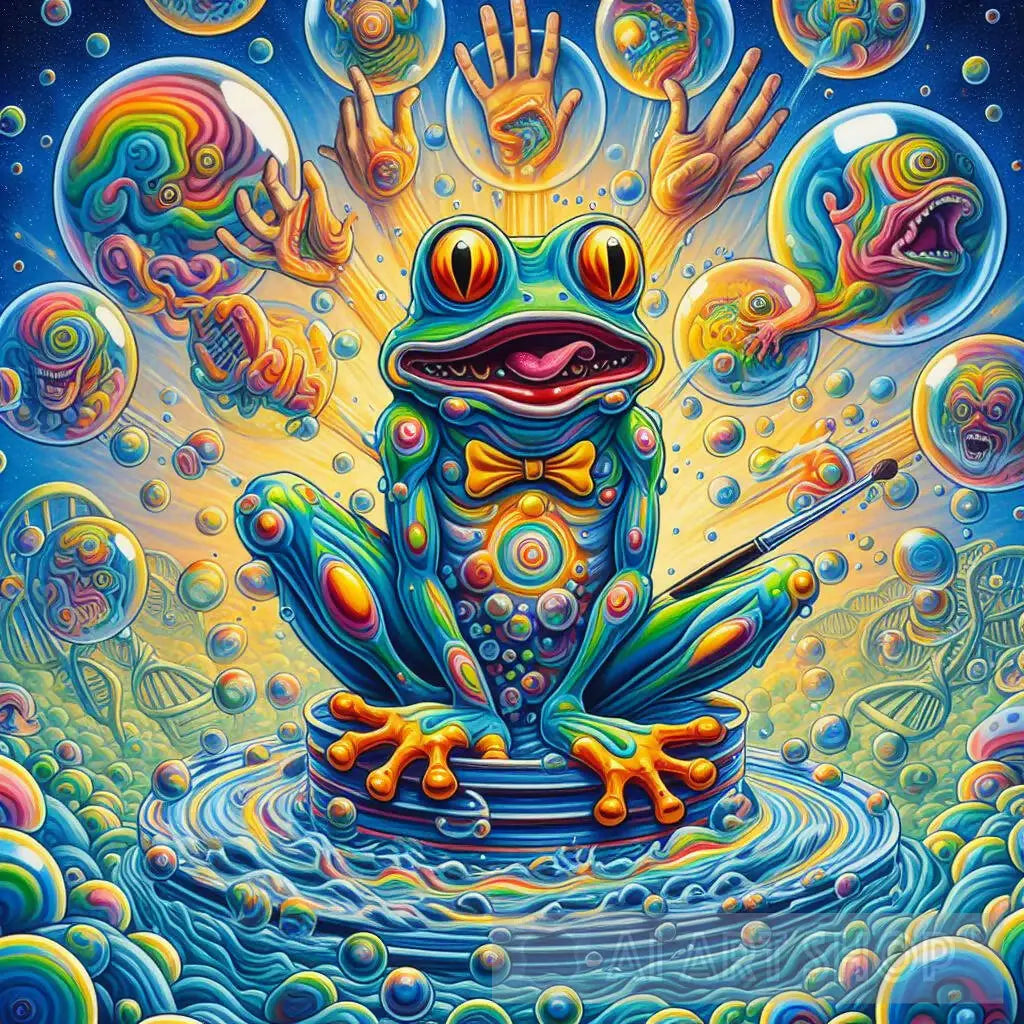 At the center of this psychedelic spectacle is the Clown Frog King, a whimsical ruler presiding over the aquatic realm. Liquid hands and feet spin and swirl, defying the constraints of ordinary physics. The character's DNA undergoes a mesmerizing morph, echoing the transformative nature of the surreal landscape.