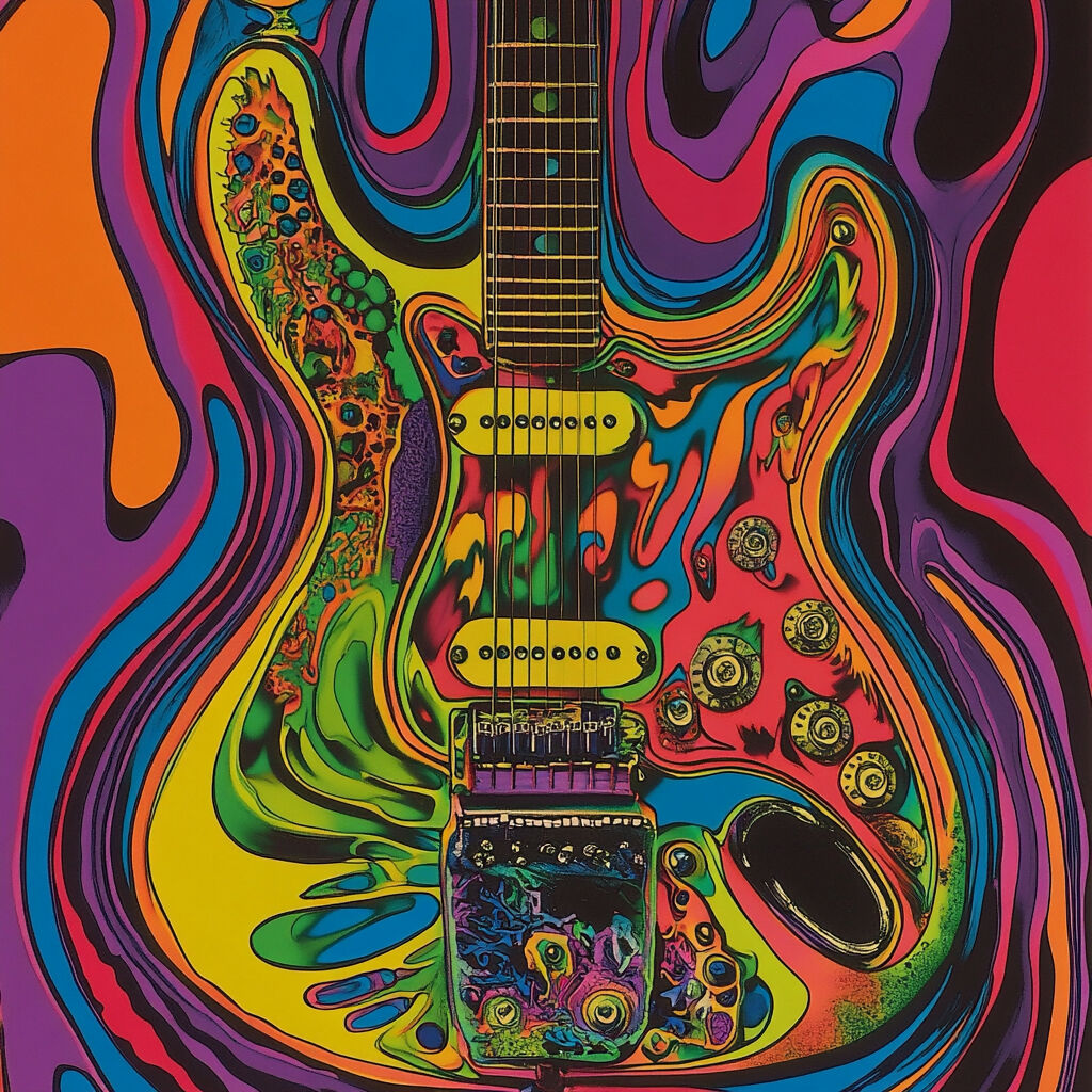 The Psychedelic Guitar painting is a vibrant, surreal artwork that captures the spirit of music and imagination. It features a guitar enveloped in swirling, colorful patterns, blending neon hues like electric blues, fiery oranges, and vivid purples. The design incorporates abstract shapes, cosmic elements, and fluid textures, evoking a sense of movement and energy. The guitar itself appears to merge with its psychedelic surroundings, symbolizing harmony between sound and visual creativity. It’s a piece that celebrates the fusion of art, music, and the free-spirited essence of the psychedelic era.