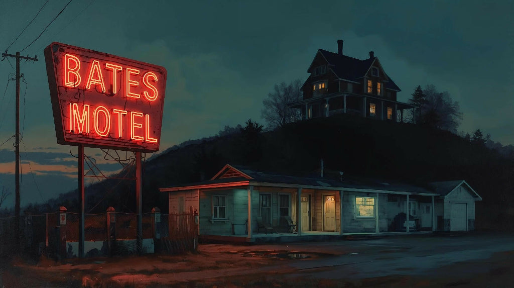 Vibrant tribute to the horror classic Psycho showing the Bates Motel and the house where Norman Bates lived.