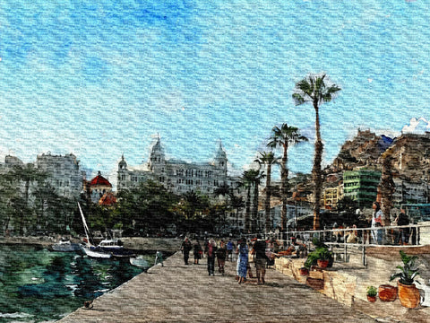 Oleo del puerto de Alicante con el añadido de la Casa Carbonell al fondo y el castillo de Santa Barbara, dos iconos de la ciudad