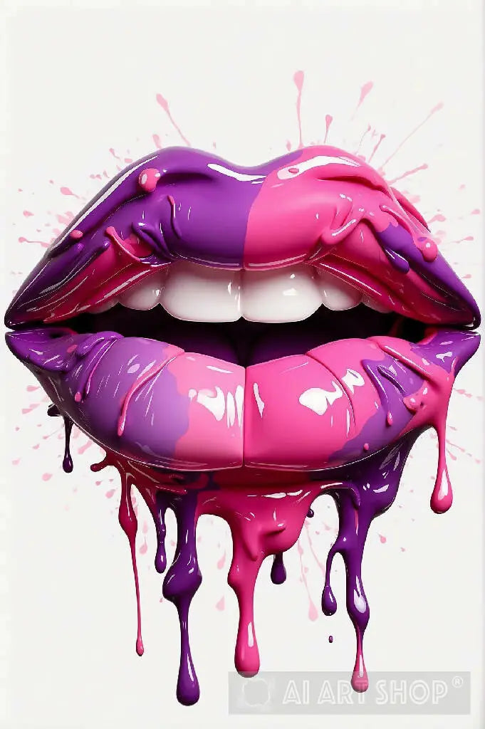 This image captures the allure of a moment frozen in time, featuring puckered lips adorned in shades of purple and pink. The meticulous detailing creates a sense of realism, enhancing the sensuous appeal. The enchanting lighting adds depth, casting delicate shadows and highlights that accentuate the textured surfaces. Against a pristine white background, the vivid colors and intricate shading pop, creating a visually striking composition. The overall effect is a captivating and romantic portrayal, symbolized by the vividly colored, drippy kiss frozen in this sublimation clipart.