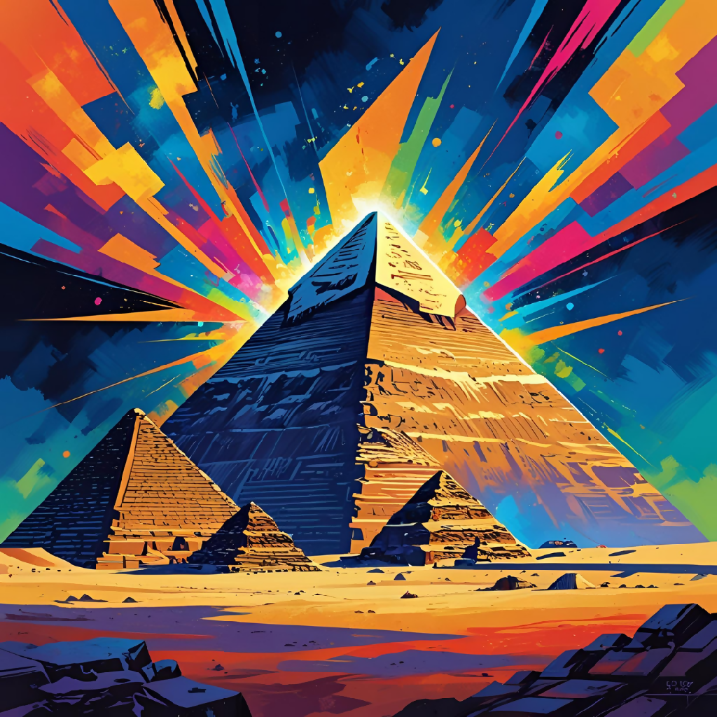 This vibrant and dynamic artwork depicts the iconic Pyramids of Giza under a dramatically stylized sky. The pyramids themselves are rendered in shades of gold and brown, with visible textures suggesting their ancient stone construction. In the foreground, the desert landscape stretches out, with hints of rocky terrain. The most striking element is the sky, which explodes with an array of bright, saturated colors—pinks, oranges, blues, and yellows—radiating outwards from behind the largest pyramid. These sharp, energetic lines create a sense of light bursting forth, almost as if the pyramids are emitting a powerful, colorful energy into the atmosphere. The overall impression is one of ancient wonder imbued with a modern, almost cosmic, vitality.