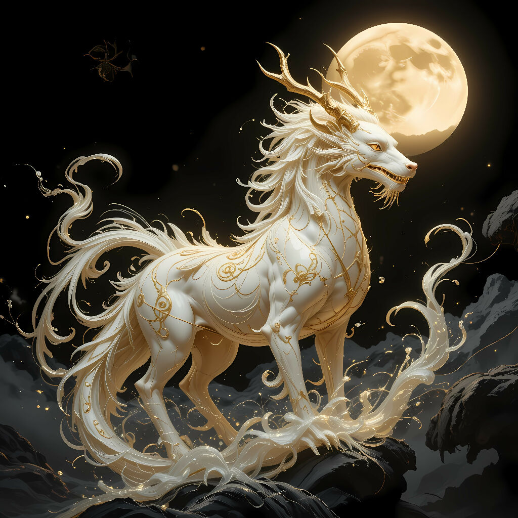 An elegant ikigai style with bright lite liquid gold, black bold, and bronze colors texture, themes " giant white Qilin mythical creature under   moon light shadow".