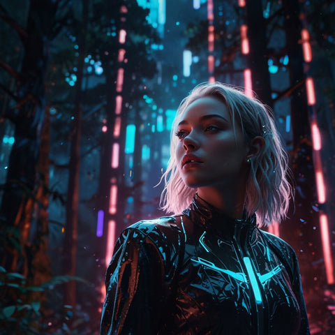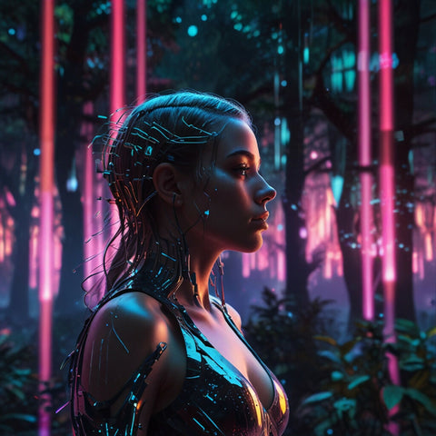 Immerse yourself in an enchanting futuristic world with “Quantum Light” . This work captures a radiant, ethereal silhouette, composed of light and crystal, hovering gracefully above a shimmering digital forest. Surreal neon hues and shimmering reflections blend harmoniously with ultra-detailed textures, creating a dreamlike atmosphere that is both supernatural and deeply immersive. A perfect fusion of cyberpunk fantasy and abstract AI aesthetics, this work evokes a sense of calm, wonder and cosmic mystery.