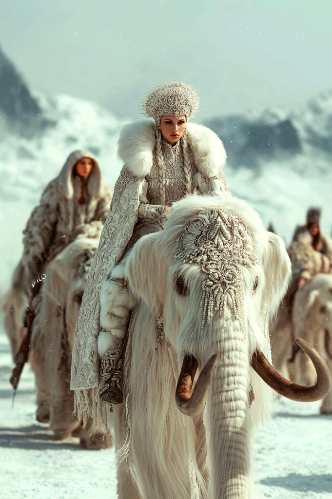 She does not conquer the ice—she remembers it. Draped in a gilded robe of ancestral might and crowned with antlered wisdom, the Queen commands her path astride a mammoth cloaked in divine ornamentation. Snow drifts around them like memory reborn, echoing through time. This is no fantasy—this is a reclamation: of matriarchal power, of primordial grace, of a world that once listened to the footfalls of giants. This piece embodies timelessness, sovereignty, and the sacred return of what was never truly lost.
