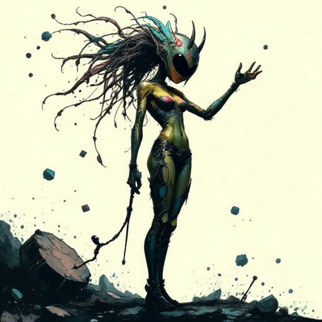 This striking artwork depicts a futuristic, otherworldly queen standing amidst a surreal, fragmented landscape. She wears a sleek, form-fitting armor with a helmet adorned with horns and intricate designs, giving her a regal yet mysterious appearance. Her hair flows wildly, almost as if it is alive, and she holds a staff or whip in one hand, exuding power and authority. The background is filled with floating debris and geometric shapes, enhancing the sense of chaos and otherworldliness. The overall mood is both powerful and enigmatic, suggesting a ruler from a distant, shattered world.