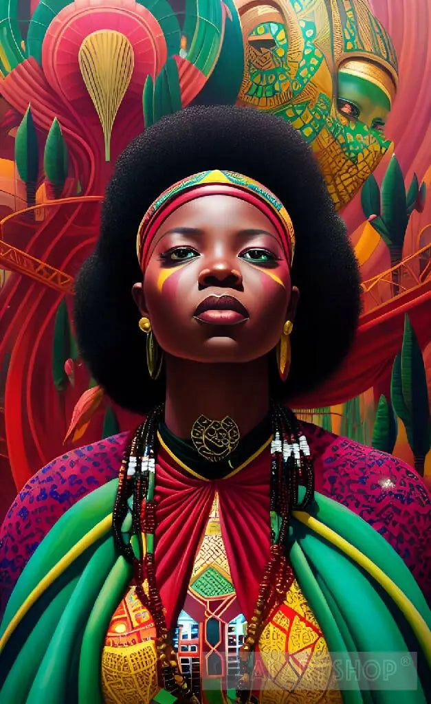 Queens of Africa Future #2"Queens of Africa Future" is a stunning series of art by Kwame Kisanii that celebrates the beauty and strength of African women. In this colorful and rich artwork, the artist depicts the queens of Africa in a futuristic setting, showcasing their power and influence in the diaspora. Each queen is beautifully portrayed, adorned with regal garments and intricate jewelry. This artwork is a tribute to the resilience and grace of African women, and a testament to their enduring legacy.