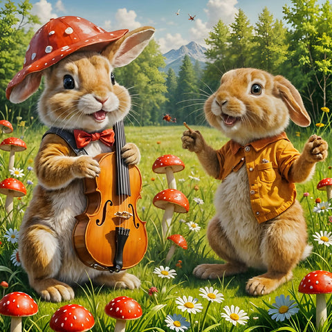 This image depicts a charming scene of two rabbits, one with a violin and the other anticipating wonderful play, surrounded by a lush green meadow with vibrant wildflowers and a sunny sky.