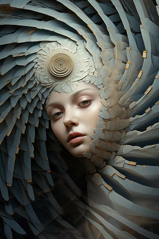Portrait of a woman, using Midjourney and Fibonacci Sequence and original fractal art as references.