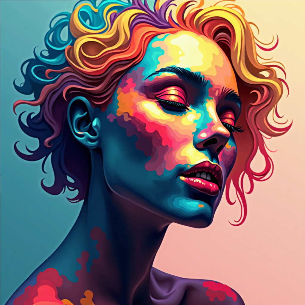 Contemporary digital portrait, intense, non-natural color and emotional impact, renders a Pop-Art-meets-vector/paint-block” technique.  “neo-expressionist digital illustration.