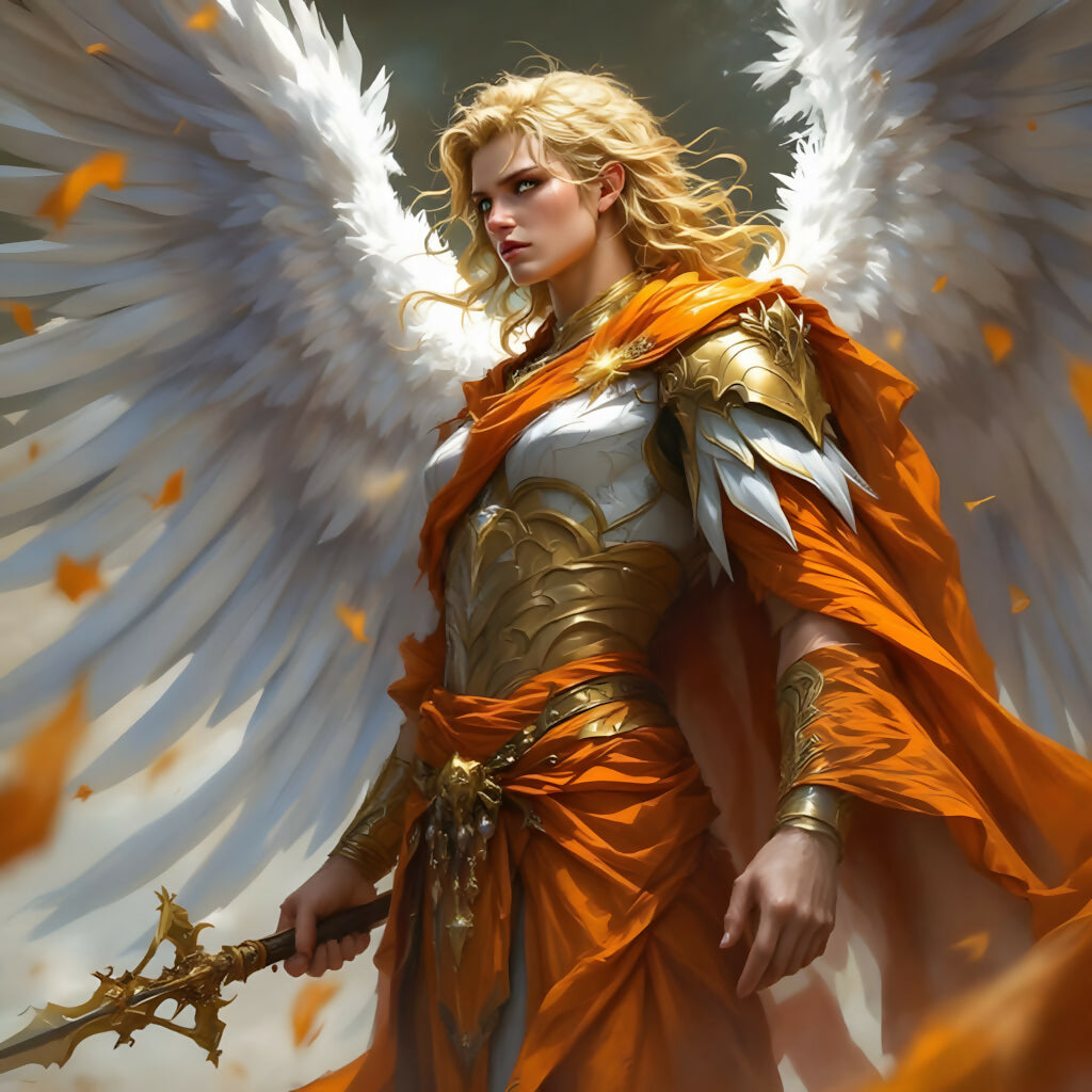 Clad in shining gold armor and wrapped in a blazing orange cloak, this celestial warrior radiates divine strength. Holding a golden sword with fierce purpose, the angel stands beneath a flurry of light and feathers, eyes focused, wings outstretched.