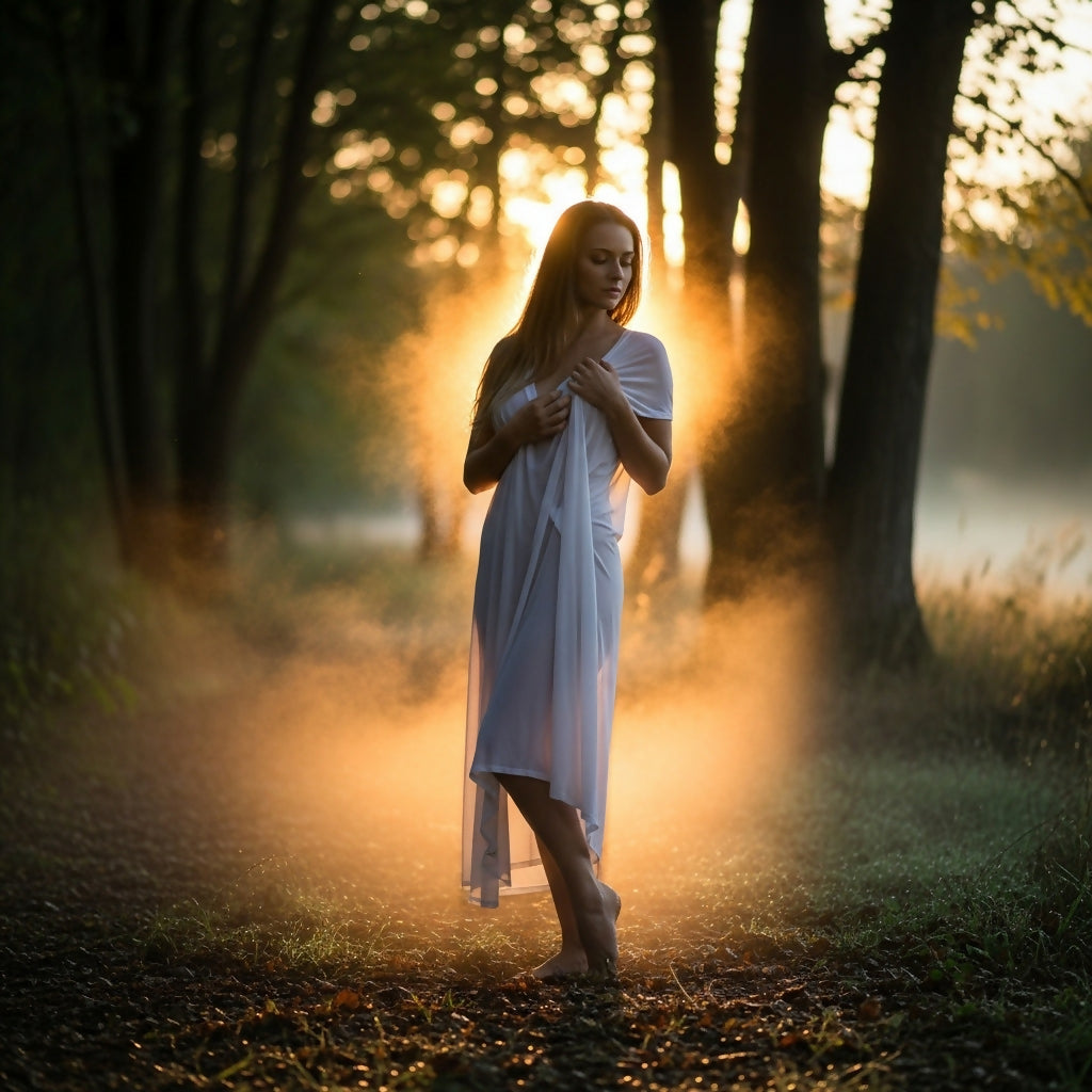 A contemplative woman stands barefoot amidst a golden, ethereal mist in a sun-dappled forest.