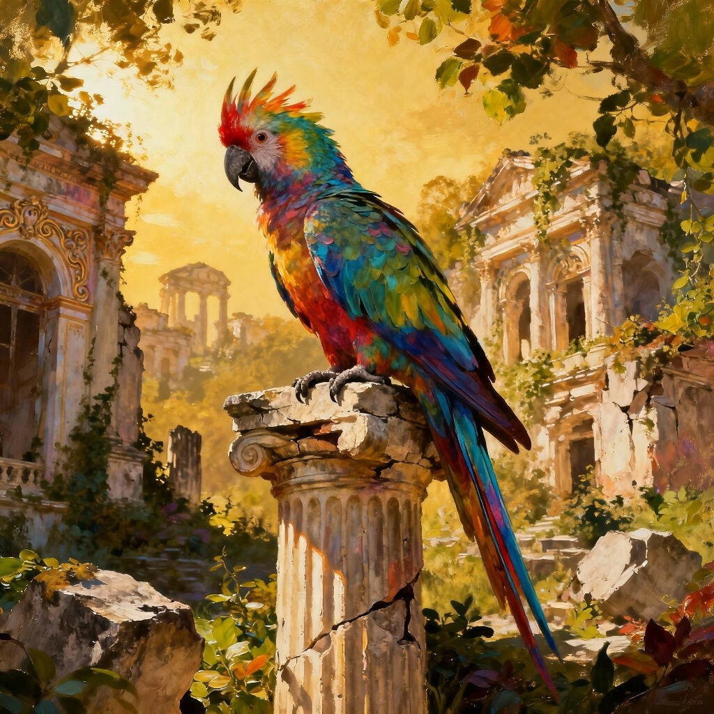 A vibrant tropical parrot perches regally on a crumbling Corinthian column, its rainbow plumage glowing against the warm, golden light of a lost ancient city. Ivy-covered arches and weathered marble ruins fade into the background, suggesting a forgotten civilization slowly reclaimed by nature.