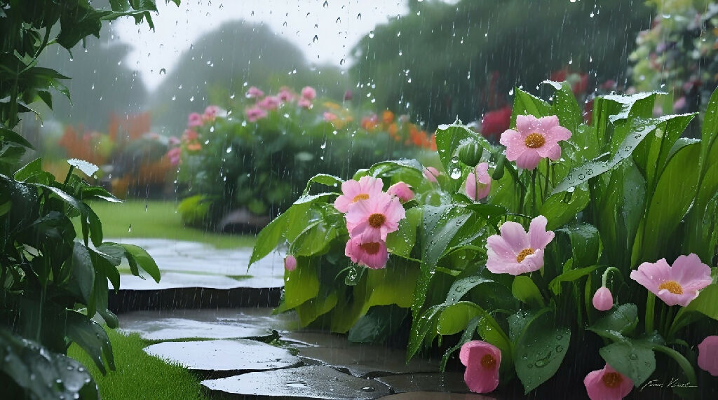 Peaceful garden in gentle rain, wet flowers and glistening paths