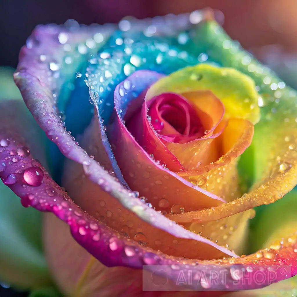 A beautiful rainbow coloured rose high resolution macro with water droplets reflecting light.