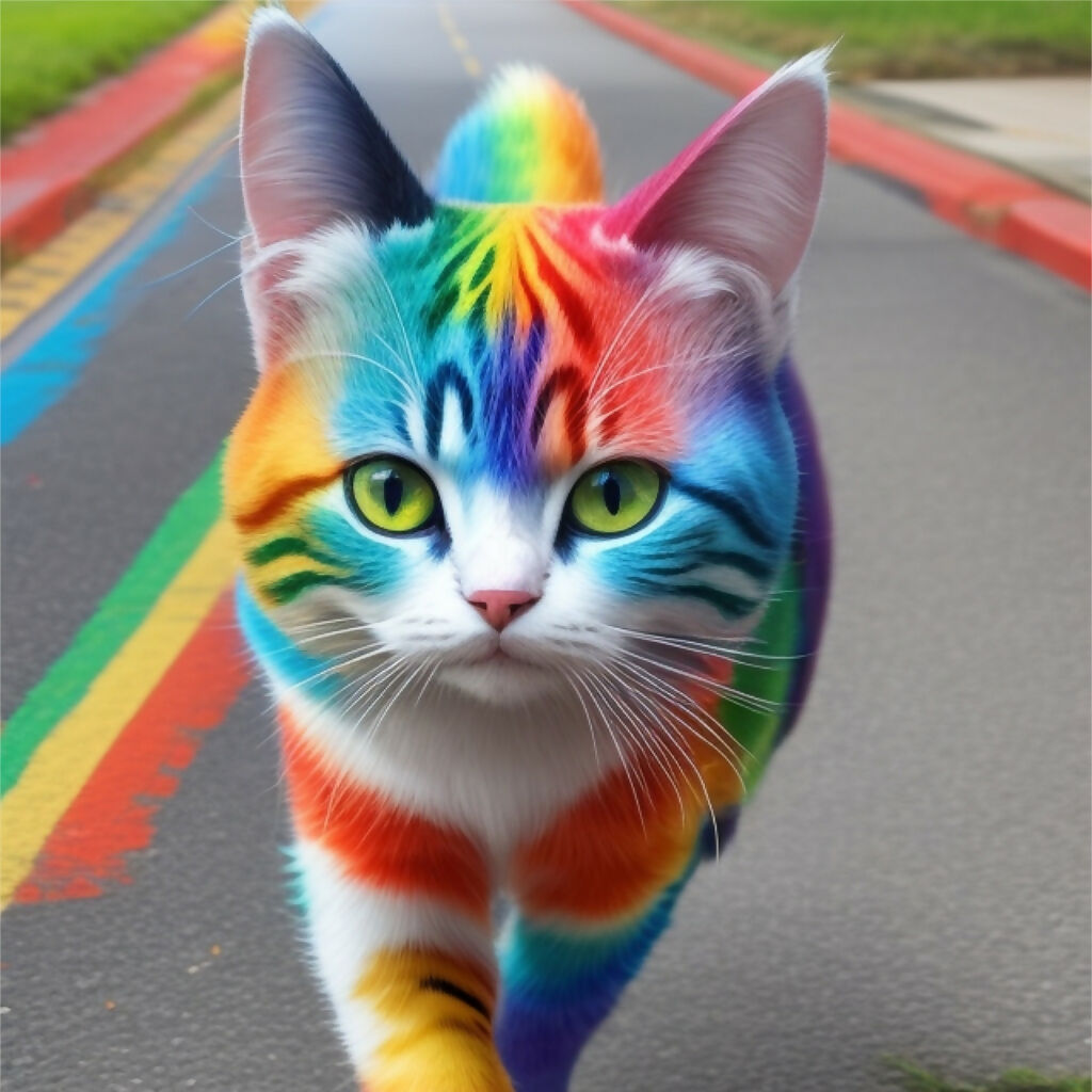 Bring vibrant energy to your space with this striking AI-generated artwork featuring a colorful rainbow-striped cat strolling down a matching vibrant road.