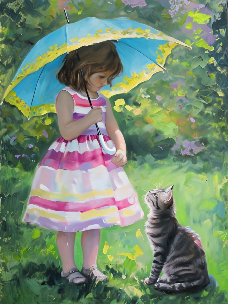 Transform your space with this enchanting digital art print featuring a whimsical little girl and her cute cat under a colorful umbrella. This adorable painting captures a magical moment, perfect for nursery wall decor, girls room art, or any space needing a touch of childhood charm and imaginative illustration.
