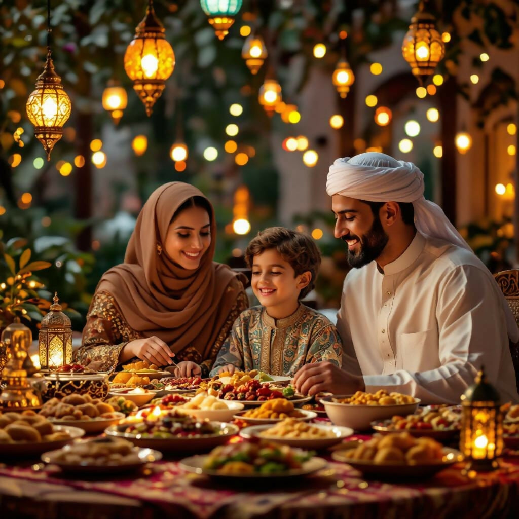 The scene reflects love, culture, and togetherness, capturing the beauty of Islamic traditions and the joy of holiday celebrations.