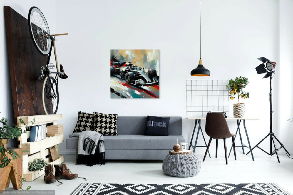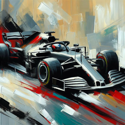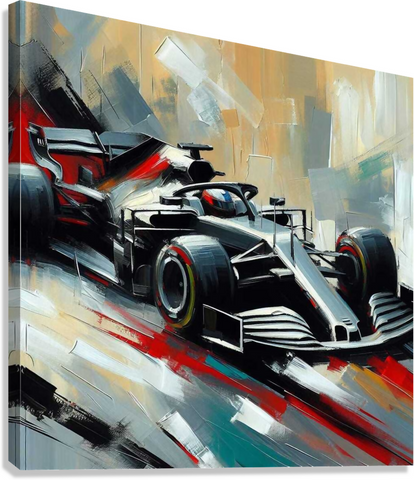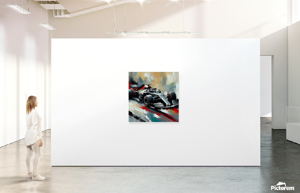 This painting was created in dramatic colors and vibrant contrasts to facilitate the intensity of Formula 1.