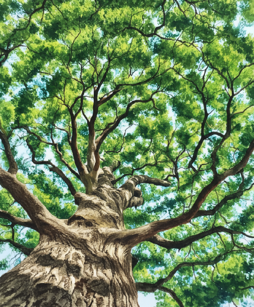 From the ground looking up, this magnificent tree stretches its twisting branches toward the bright sky, covered in lush green leaves that shimmer under the sunlight. A stunning perspective that captures the vitality, strength, and timeless beauty of nature in full bloom. 🌳☀️