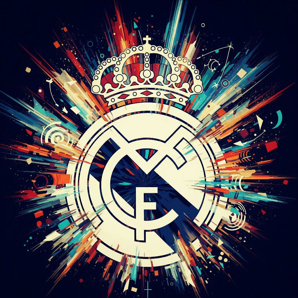 This is a vibrant and dynamic image featuring the Real Madrid logo. The logo, predominantly in light colors, is centered and stands out against a dark background. It is encircled by an explosive burst of colorful, abstract shapes and lines in shades of red, orange, blue, and white, radiating outwards. This gives the impression of energy, excitement, and movement, making the classic logo appear modern and artistic. The overall style is graphic and digitally enhanced, with a contemporary feel.