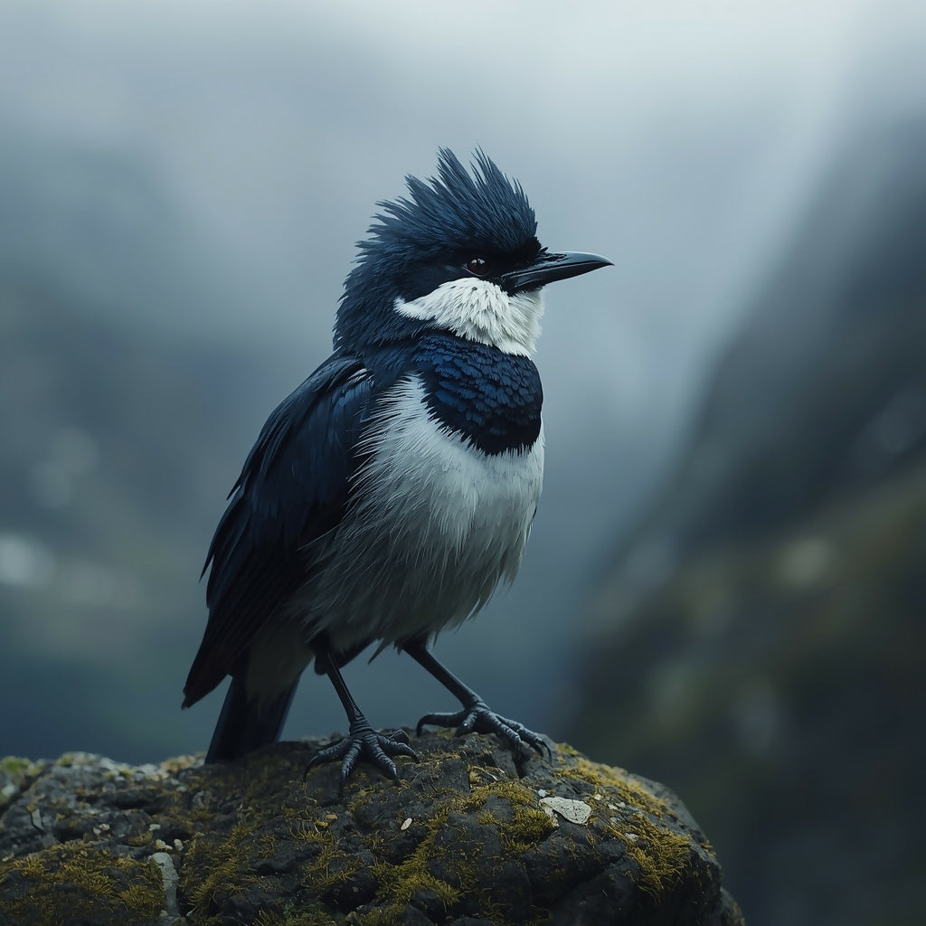 A realistic exotic bird with deep blue and white plumage, perched on a mossy rock in the mountains, cool misty atmosphere, natural lighting, highly detailed close-up shot, 8K wildlife photography style.