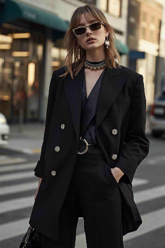 Realistic street style fashion photography, model in oversized blazer and statement accessories, urban backdrop with soft natural lighting, candid editorial aesthetic, high-resolution detail, styled like a fashion week shot