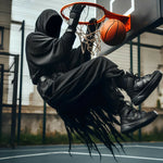 This hooded baller thinks he can just waltz in and dominate the court.