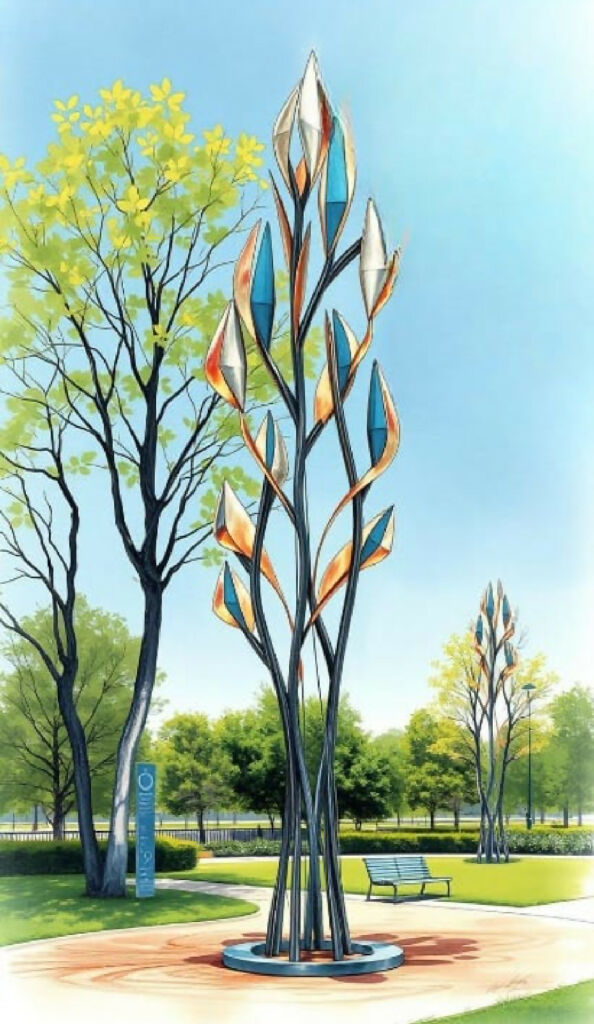 The image shows a park scene with a tall, modern sculpture as the focal point. The sculpture consists of multiple elongated, leaf-like shapes in metallic colors, including silver, orange, and blue, arranged on slender, black stems that converge at the base. The sculpture stands on a circular platform. Surrounding the sculpture are green trees with fresh foliage, a blue sky, a bench, and a pathway. Another similar sculpture can be seen in the background. The scene is serene and aesthetically pleasing, highlighting the blend of natural and artistic elements in the park.