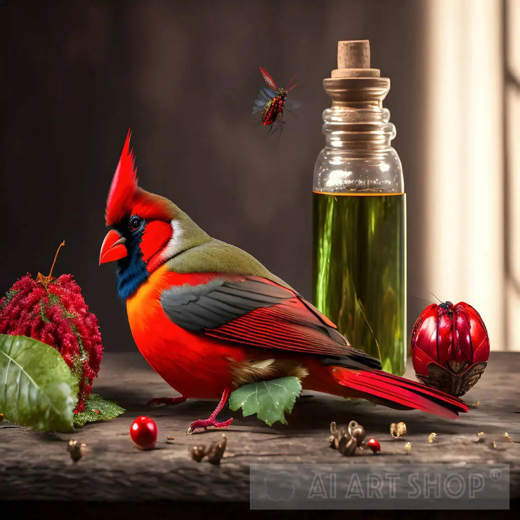 Extravagant Red Bird on the Country Tabletop, unique scene, attractive colors.