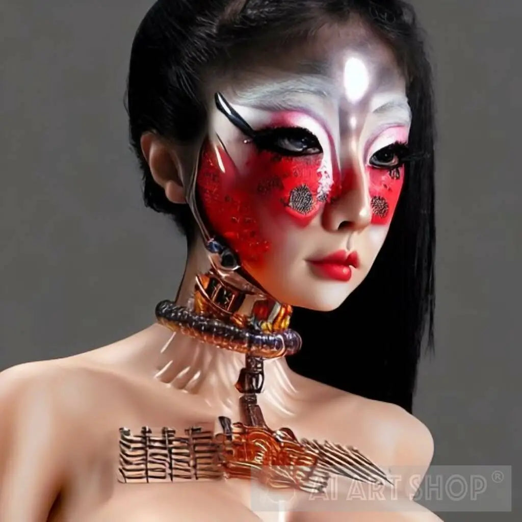17088490. an especially beautiful pleasure courtesan Geisha of the Red Clan with red face masking enhanced throat muscle implants and stimulator unit