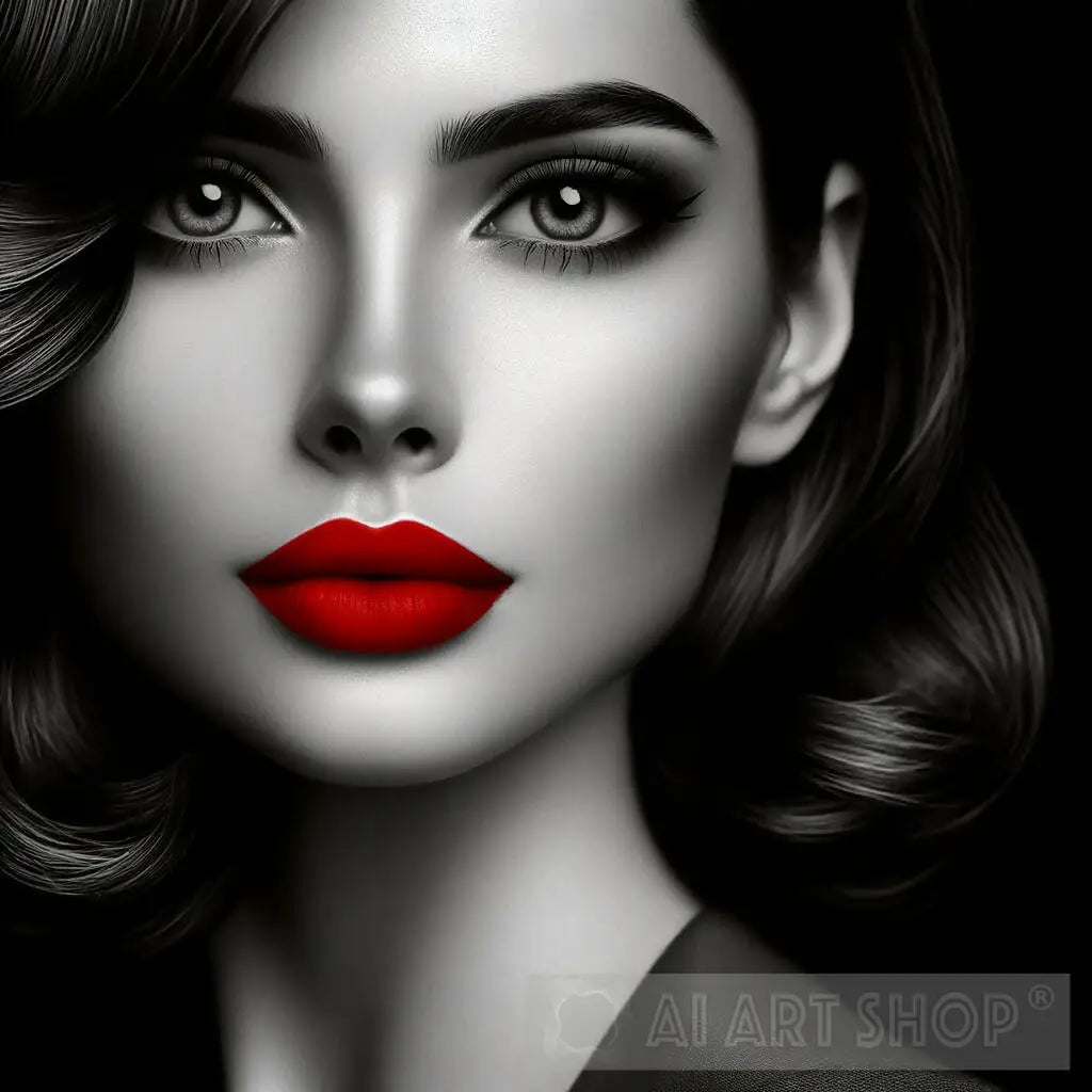 The image is a close-up portrait of a woman's face, rendered in monochrome except for her bright red lipstick, which provides a stark, vivid contrast. Her skin appears flawless, and her facial features are sharp and well-defined. She has arched eyebrows, high cheekbones, and her eyes are accentuated with dark eyeliner and mascara, giving them a captivating intensity. The woman's hair is styled in soft, wavy curls that frame her face. The background is pure black, highlighting her features and the striking red of her lipstick. The overall effect is dramatic and elegant.