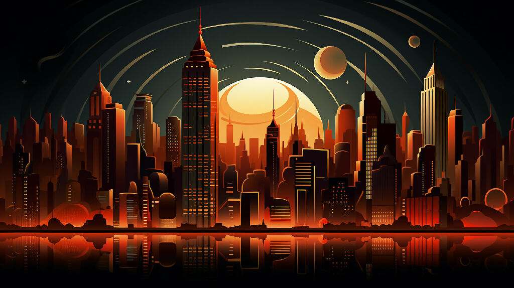 The artwork depicts a sprawling futuristic cityscape on an alien planet bathed in a deep red glow. Towering skyscrapers with sleek, angular architecture pierce the sky. The overall tone is both ominous and awe-inspiring—a vivid vision of a civilization thriving under the scarlet light of a foreign world.