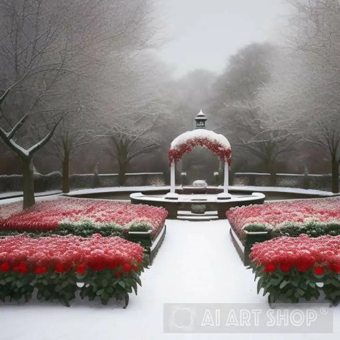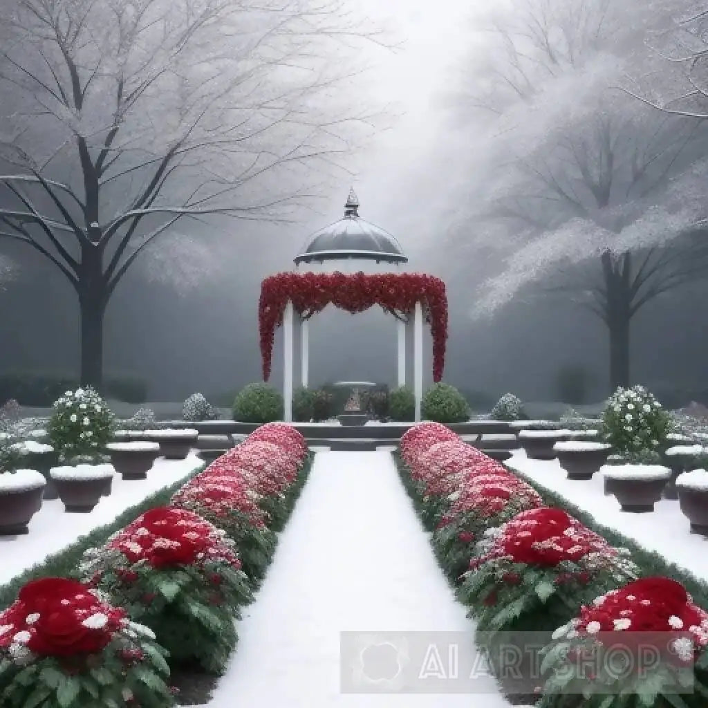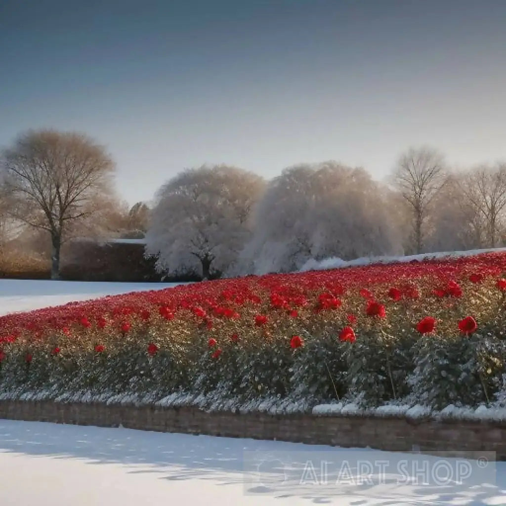 As the delicate snow descends from the heavens, it drapes the garden in a blanket of softness, creating a mesmerizing scene of juxtaposition. The scarlet roses, with their rich hues, seem to defy the wintry chill, casting a fiery glow amidst the frosty air.