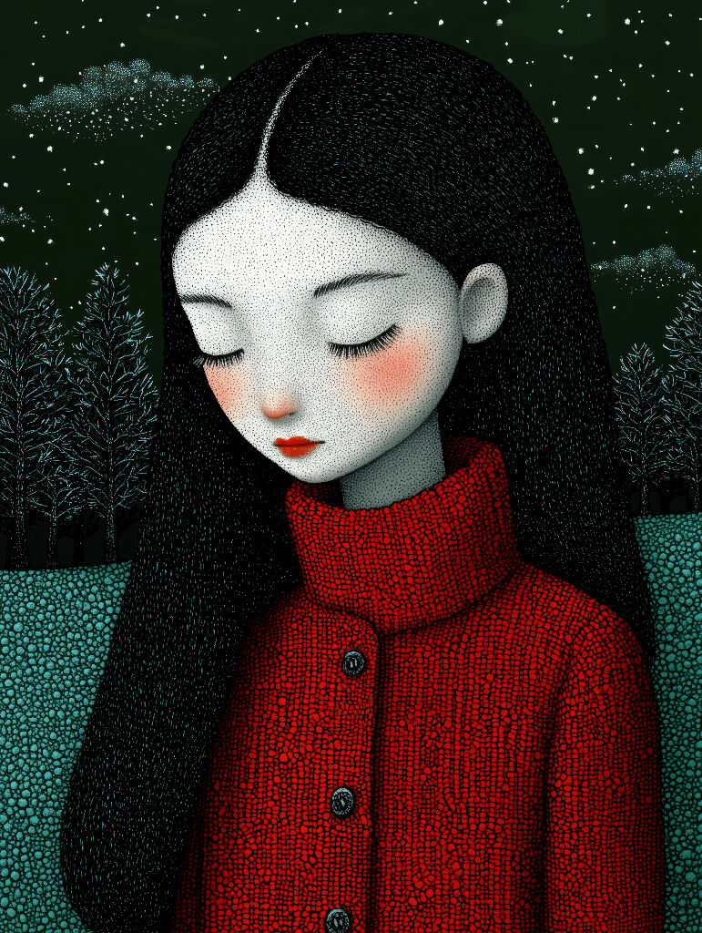 ✨ Red Whisper captures a moment of calm introspection, portraying a serene young woman in a red coat under a starry night. Its minimal, poetic atmosphere makes it a timeless and emotional piece.