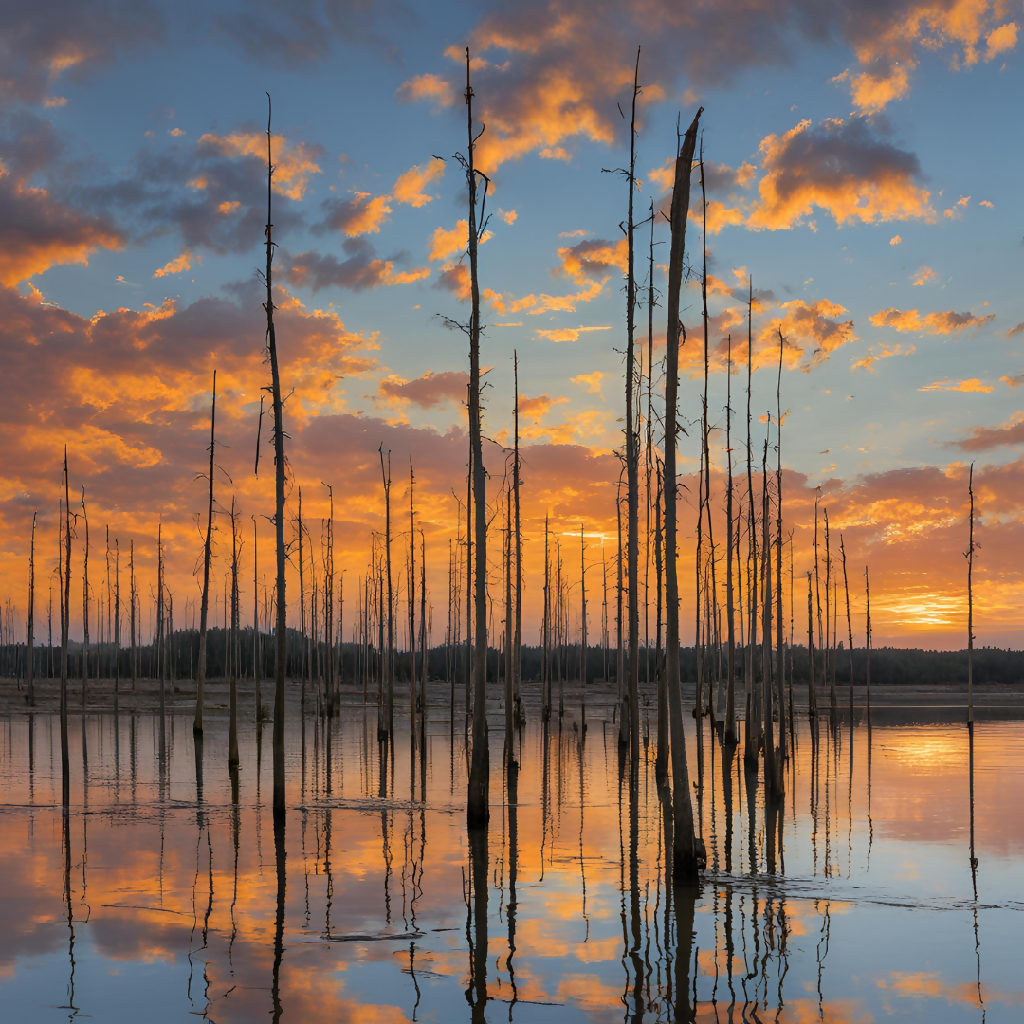 This piece is in the style of photorealism. The high level of detail, natural lighting, and realistic depiction of the landscape suggest that it closely resembles a photograph. The scene evokes a serene and slightly surreal atmosphere, with the reflections in the water adding a dreamlike quality.