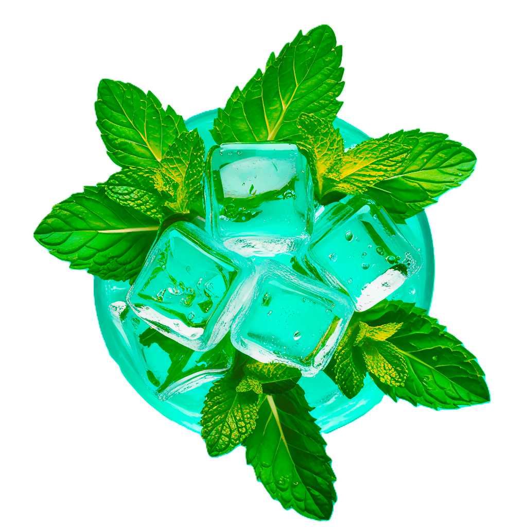 The image features a refreshing arrangement of ice cubes nestled among vibrant mint leaves against a serene, aqua background. The transparent ice, glistening with droplets, adds a cool texture, while the lush green mint leaves bring a pop of color and a natural feel. The overall composition evokes a sense of freshness and coolness, suggesting a drink or a summer vibe. The interplay of the ice and mint hints at cool beverages, perhaps a mint-infused cocktail or a refreshing mint tea.
