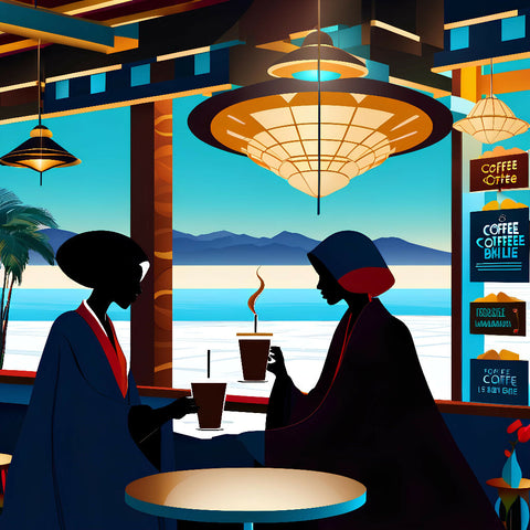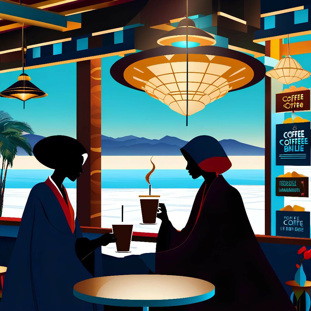 Indulge in the rich aroma of freshly brewed coffee, as your gaze is drawn to the captivating interplay of geometric shapes and vibrant hues that dance across the horizon.