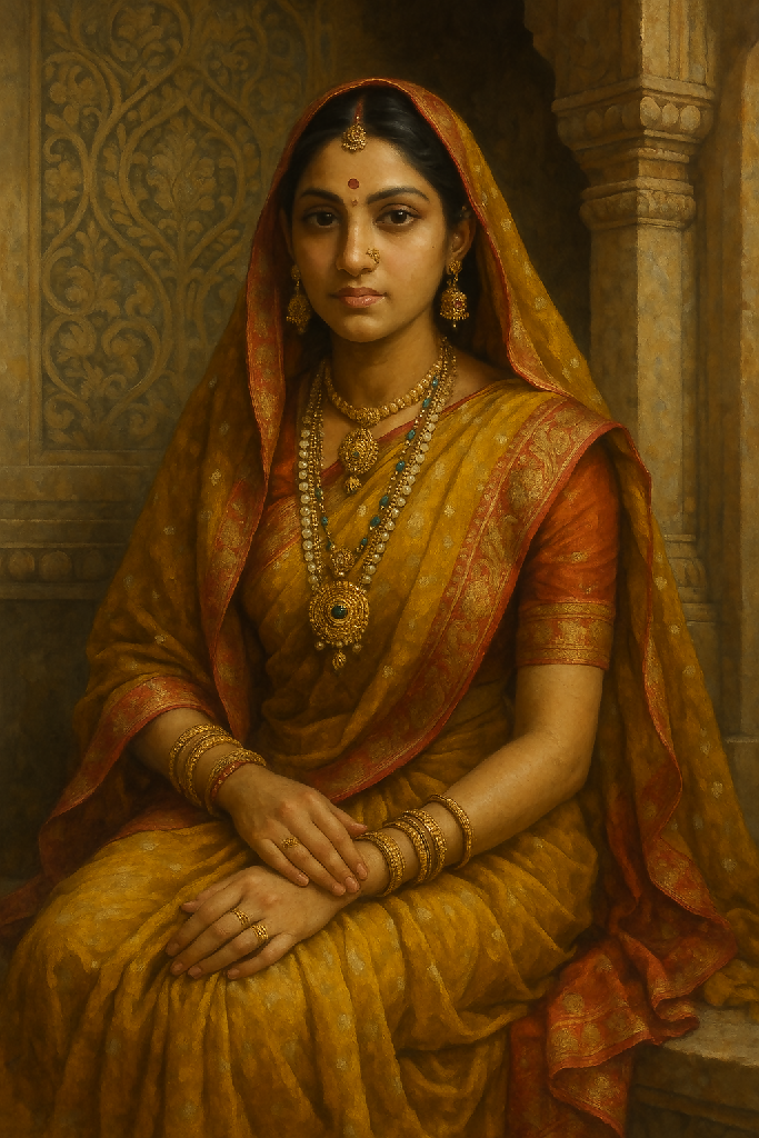 Immerse yourself in the timeless beauty of Indian heritage with “Regal Grace,” a hyper-detailed oil-style watercolor painting portraying a royal Indian woman in a mustard-yellow saree with intricate red and gold embroidery. Her serene expression, adorned with traditional jewelry, evokes elegance and strength rooted in cultural pride. Set against a carved sandstone archway, the painting captures the essence of India’s royal past with rich textures, earthy tones, and exquisite realism. Perfect for collectors, luxury decor enthusiasts, and lovers of fine traditional art.