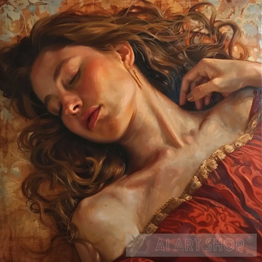This painting is a strikingly detailed and realistic depiction of a woman lying down, captured in a state of serene repose. The meticulous attention to detail in her soft, flowing hair and the delicate features of her face evokes a sense of peacefulness. The rich texture of her ornate, red dress contrasts beautifully with her luminous skin, enhancing the overall warmth of the composition. The backdrop, with its textured, aged appearance, contributes to the timeless quality of the piece